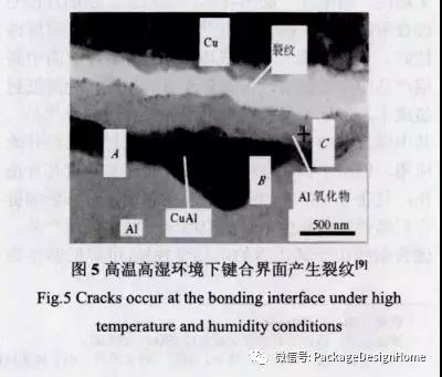 随著(zhe)微電子封裝行業的快速發(fā)展,鍵合銅線因其優良的力學(xué)性能(néng)和電學(xué)性能(néng)且成(chéng)本較低,越來越多的在分立器件、表面(miàn)貼裝型封裝(SOP)等中廣泛應用。其中微合金銅線、鍍钯銅線等高性能(néng)銅線逐步被(bèi)應用于集成(chéng)電路中。但是鍵合銅線容易氧化(如圖3所示),在球焊過(guò)程中須采用N2+H2混合氣體保護,增加了使用成(chéng)本。此外銅線硬度過(guò)高又容易造成(chéng)基闆損傷,形成(chéng)“彈坑”缺陷(如圖4所示)。鍵合銅線在高溫高濕環境下鍵合界面(miàn)生成(chéng)了Cu9A14金屬間化合物,在弱酸環境下易腐蝕,進(jìn)而鍵合界面(miàn)形成(chéng)裂紋(如圖5所示),導緻引線鍵合失效,這(zhè)些都(dōu)阻礙了銅鍵合線在高端微電子封裝中的應用。