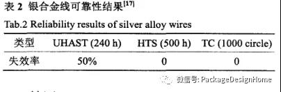 2.2.3銀合金線的可靠性Gu等進(jìn)一步對(duì)銀合金線進(jìn)行了高加速溫濕度測試(UHAST)、高溫儲存測(HTST)、溫度循環測試(TCT),測試結果如表2所示。UHAST240h時(shí)約50%的芯片發(fā)現了電氣腐蝕問題,但HTS能(néng)通過(guò)500h,TCT能(néng)通過(guò)1000個循環。通過(guò)增加钯的含量可有效抑制界面(miàn)腐蝕已被(bèi)研究者們證實,調整銀合金線中微量元素的含量可使其可靠性進(jìn)一步提高。由于氧氣的存在,銀線在高溫高濕環境中會(huì)産生電化學(xué)腐蝕,使界面(miàn)産生裂紋。對(duì)于銀合金線,由于钯的存在,钯與氧形成(chéng)PdO富集在表面(miàn)阻礙銀離子擴散,界面(miàn)沒(méi)有裂紋。