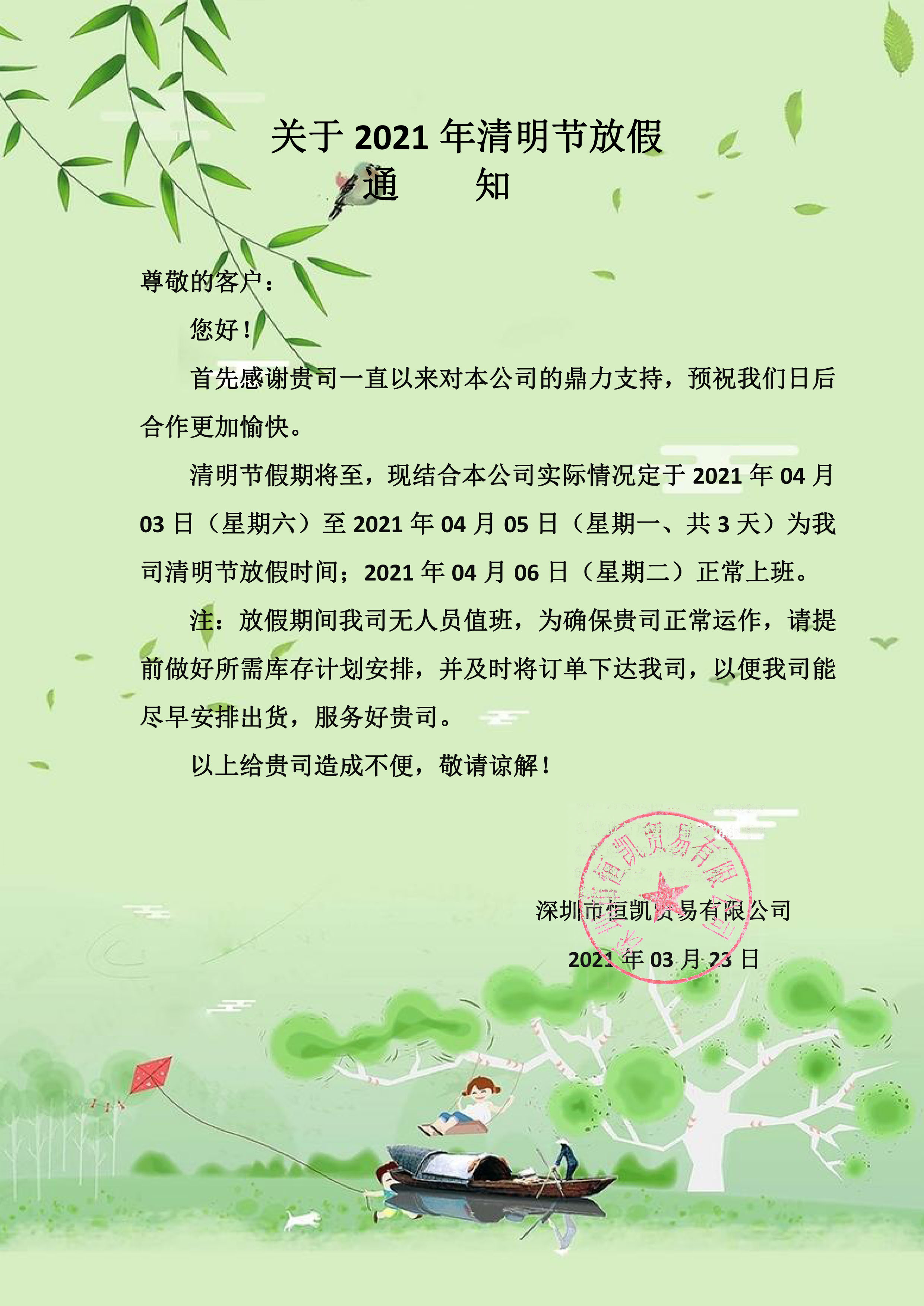 清明節假期將(jiāng)至,現結合本公司實際情況定于2021年04月03日(星期六)至2021年04月05日(星期一、共3天)爲我司清明節放假時(shí)間;2021年04月06日(星期二)正常上班。
