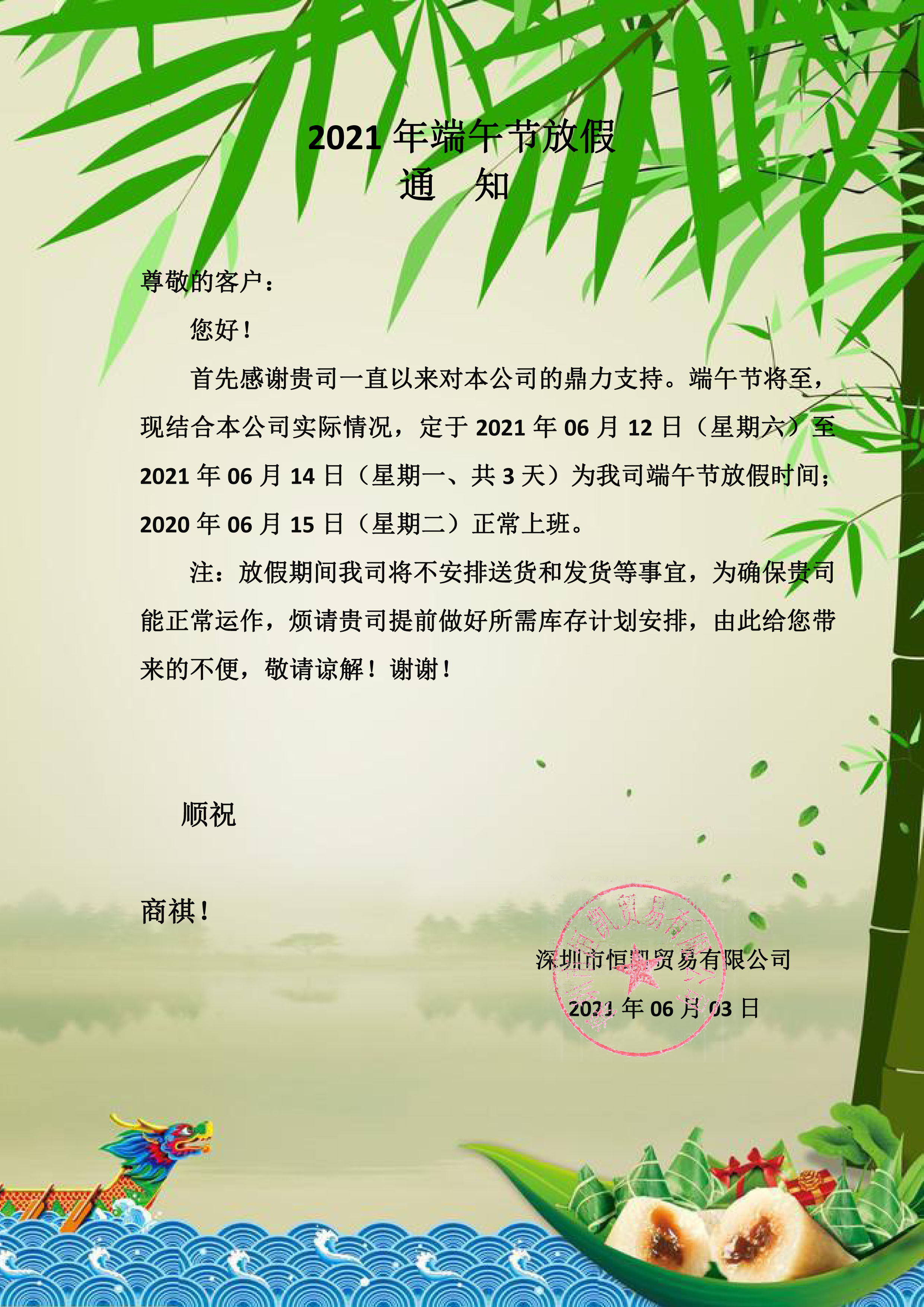 首先感謝貴司一直以來對(duì)本公司的鼎力支持端午節將(jiāng)至,現結合本公司實際情況,定于20210612日(星期)至20210614日(星期、共3天)爲我司端午節放假時(shí)間;20200615日(星期)正常上班。