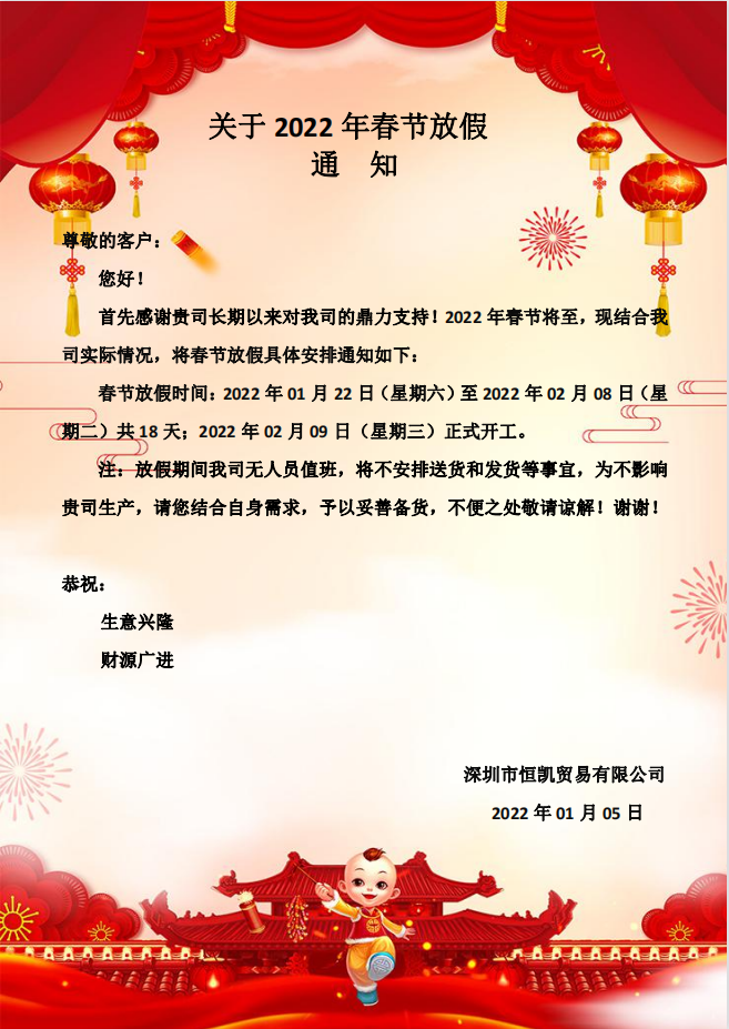 首先感謝貴司長(cháng)期以來對(duì)我司的鼎力支持!2022年春節將(jiāng)至,現結合我司實際情況,將(jiāng)春節放假具體安排通知如下: